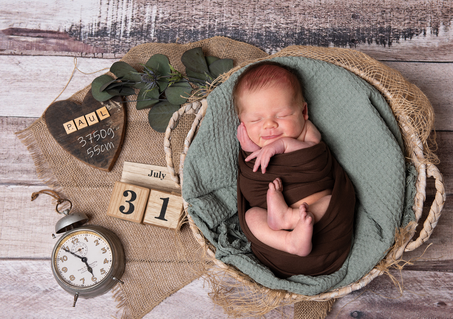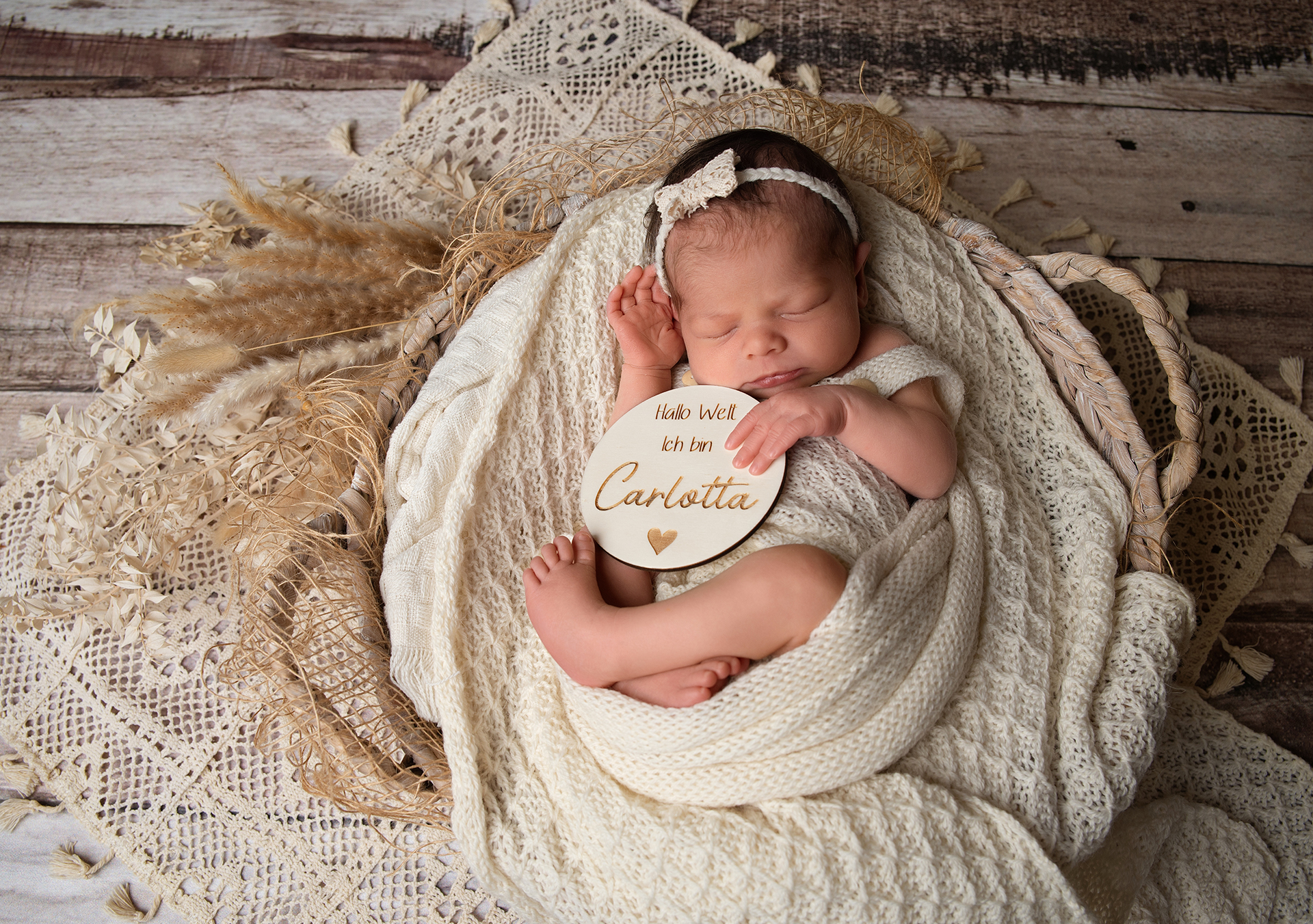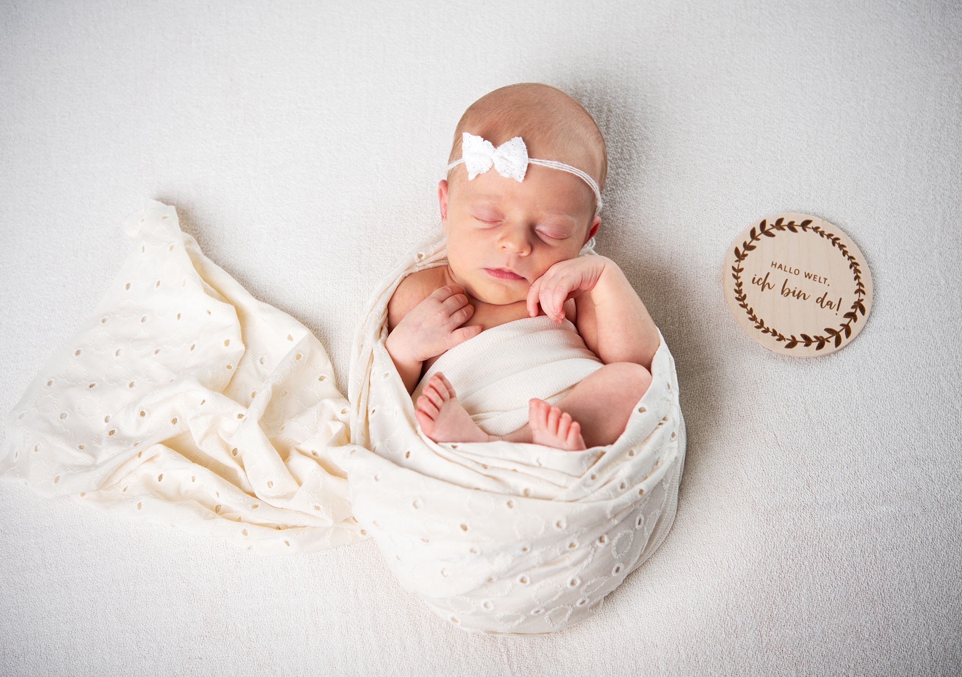 Damit sich euer Baby besonders wohlfühlt, bereite ich mein Studio ruhig und warm vor. Drei bis fuenf verschiedene Sets werden von mir detailverliebt hergerichtet, unter anderem eines mit den Geburtsdaten.